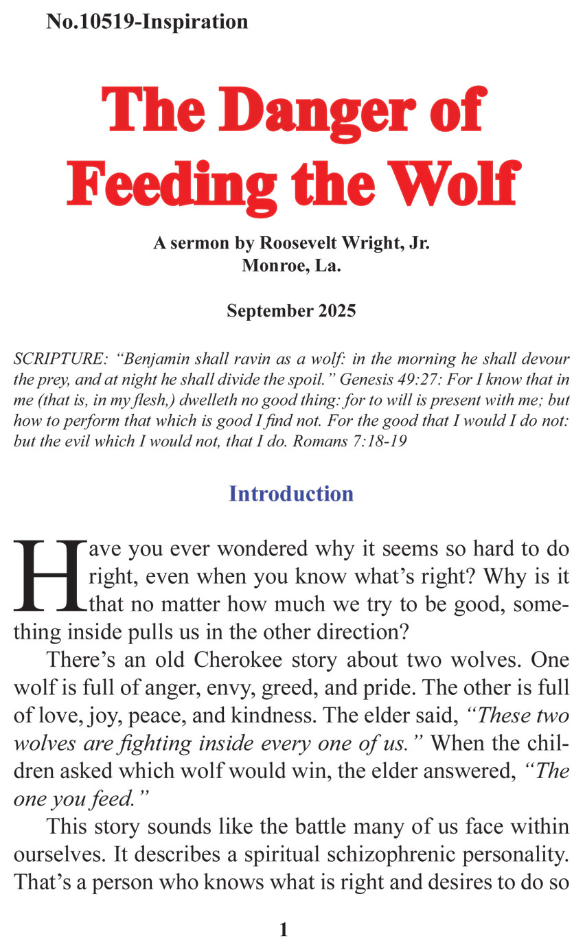 There is a ravenous spirit within us that tries to get us to sin. We must be careful not to feed the wolf that will prompt us to betray our Lord.